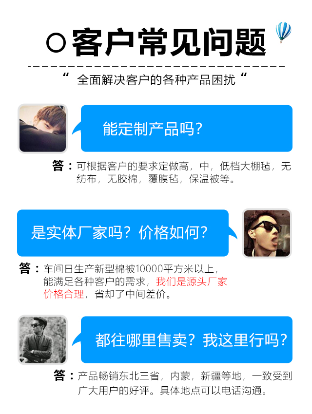 本公司設備齊全,可生產智能大棚骨架,彎管機,暖風爐等農業設備,另制造棉被生產自動化設備,自動上料機,輸棉機,絎縫機等。質量可靠,注重創新。公司擁有雄厚的實力,先進的生產線,豐富的經驗,可根據客戶的要求定做高,中,低檔大棚氈,無紡布,無膠棉,覆膜氈,保溫被等,車間日生產新型棉被10000平方米以上,能滿足各種客戶的需求,新型保溫被產品在國內研發中始終保持在前列。